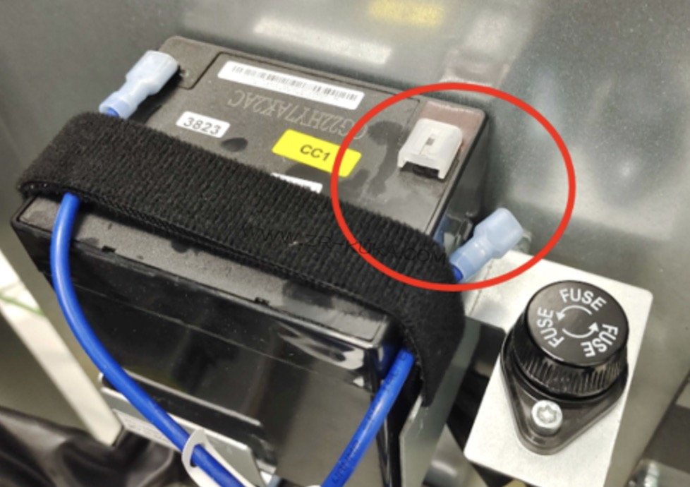 打開柜門,柜門上有兩塊蓄電池,上方蓄電池的兩個插頭有一個處于斷開狀態(tài)需連接。請注意接線的標識。