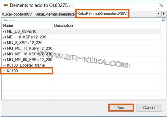 Step 4 選擇KukaExternalKinematics230V → KL100 → Add