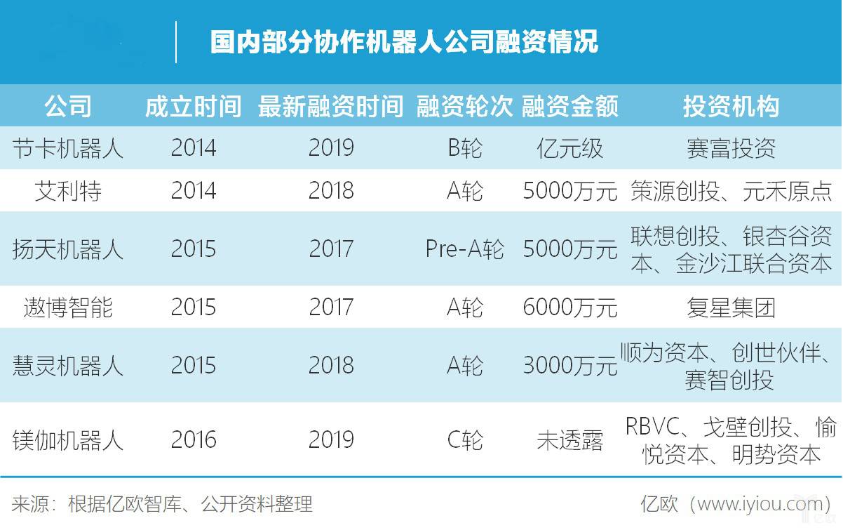 在資本層面,根據國內部分協作機器人融資情況發現,國內協作機器人融資輪次大多以A輪為主,處于成長初期向穩定期過渡的階段。其中值得注意的是,節卡機器人2014年成立后,到2019年已經完成B輪融資,另外,鎂伽機器人2016年成立后,到2019年已經完成C輪融資,這兩家企業發展速度在同期成立的協作機器人企業中較為迅速。