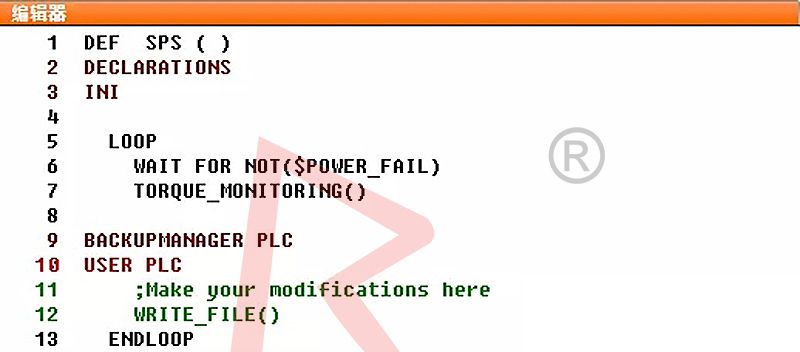 DEF Write_File( )DECL INT handleDECL STATE_T STATDECL MODUS_T MODEDECL CHAR AxisPos[256]DECL CHAR ProState[256]DECL CHAR ErrorID[256]DECL CHAR FILENAME[256]DECL INT OffsetDECL BOOL bokDECL char LF MODE = #SYNCHANDLE = 0OFFSET=0bOK=STRCLEAR(AXISPos[])BOK=STRCLEAR(Prostate[])BOK=STRCLEAR(ERRORID[])LF = 10SWRITE(AxisPos[],STAT,Offset,"%S:%F|%F|%F|%F|%F|%F","Current Axis Position",$AXIS_ACT.A1,$AXIS_ACT.A2,$AXIS_ACT.A3,$AXIS_ACT.A4,$AXIS_ACT.A5,$AXIS_ACT.A6)Offset=0SWITCH $PRO_STATE1 CASE #P_ACTIVE ProState[]="Program State: RobotProgram is selected and running!" CASE #P_FREE ProState[]="Program State: RobotProgram is deselected!" CASE #P_END ProState[]="Program State: RobotProgram is selected and the end of program has been reached!" CASE #P_RESET ProState[]="Program State: RobotProgram is selected and has been stopped and reset!" CASE #P_STOP ProState[]="Program State: RobotProgram is selected and has been stopped!"ENDSWITCHSWRITE(ERRORID[],STAT,offset,"ErrorINFO: ERRORID-%D|LINENR-%D|PROG-%S|SUB-%S",$ERR.NUMBER,$ERR.LINE_NR,$ERR.MODULE[],$ERR.UP_NAME[])offset=0IF STRCLEAR(FILENAME[])THENSWRITE(FILENAME[],STAT,offset,"%D%D%D-%Dh%Dm%Ds.txt",($DATE.year),($DATE.MONTH),($DATE.DAY),($DATE.HOUR),($DATE.MIN),($DATE.SEC))ENDIFWAIT FOR TIMER_LIMIT(10) CWRITE($FCT_CALL,STAT,MODE, "krl_fopen",FILENAME[], "w", HANDLE)CWRITE($FCT_CALL, STAT, MODE, "krl_fputs", HANDLE, AxisPos[])CWRITE($FCT_CALL, STAT, MODE, "krl_fputc", HANDLE, LF) CWRITE($FCT_CALL, STAT, MODE, "krl_fputs", HANDLE, PROSTATE[])CWRITE($FCT_CALL, STAT, MODE, "krl_fputc", HANDLE, LF) CWRITE($FCT_CALL, STAT, MODE, "krl_fputs", HANDLE, ErrorID[])CWRITE($FCT_CALL, STAT, MODE, "krl_fclose", HANDLE)END2.在SPS里調用該程序: