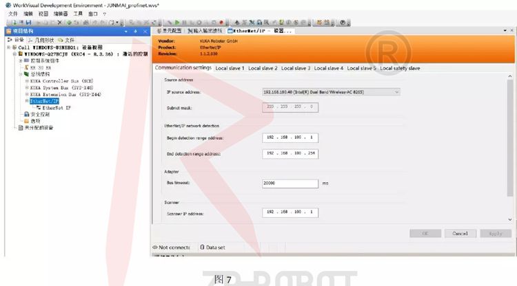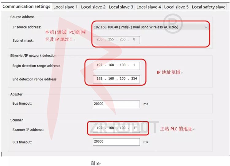 二者通過Ethernet/IP協議進行通訊:PLC作為Scanner,機器人作Adapter |