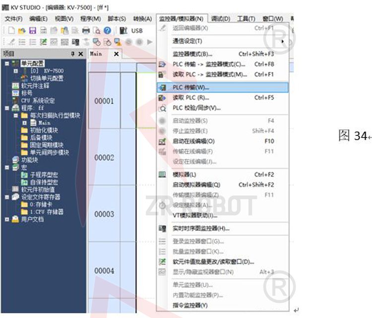 G.回到主界面,如圖34,在監控器/模擬器欄選擇PLC傳輸,將新項目上床到PLC控制器,在線監控二者數據交互是否一致(PLC->Robot,Robot->PLC)