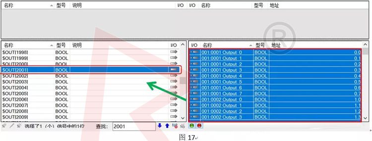 e.圖17界面后,選擇機器人輸出的起始位置,在右邊框里CTRL+A選擇PLC的所有信號后,將其拖拉至左邊機器人的起始位置,如$out[2001],鏈接完成后,可以看到如圖18的紅色區域,表示映射完成;