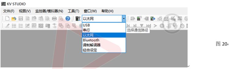 A.打開編程配置軟件KVStudio,選擇調試PC與PLC控制器連接方式如圖20,選擇了以太網(二者IP在同一網段)