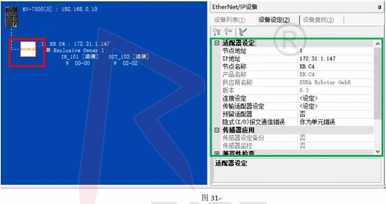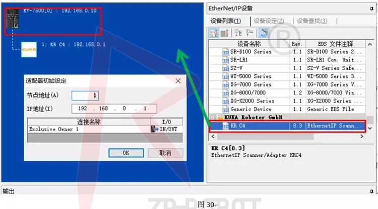 C.如圖30,在右側Ethernet/IP設備欄里找到機器人,選中后將其拖拉到左邊控制器下,此時會彈出設置框用于適配器(從站)初始設定,IP設定,結點地址設定,完成點擊OK;