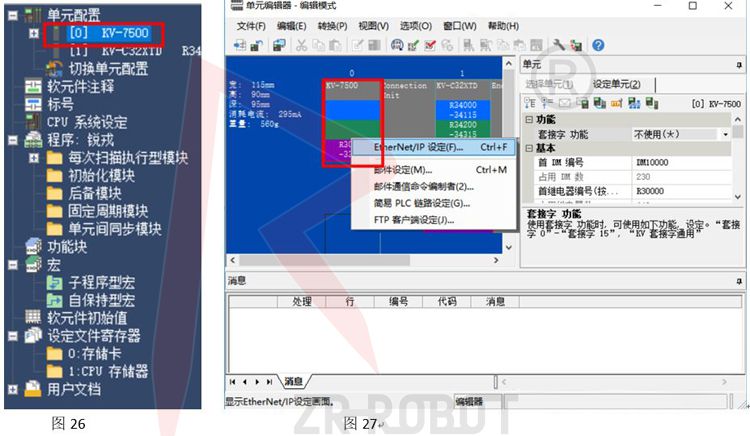 A.在如圖26界面鼠標左鍵雙擊控制器KV-7500(如紅色區域),進入如圖27的單元編輯欄,鼠標右鍵單擊圖中紅色區域的PLC控制器KV-7500后,選擇Ethernet/IP設定欄進入Ethernet/IP配置;