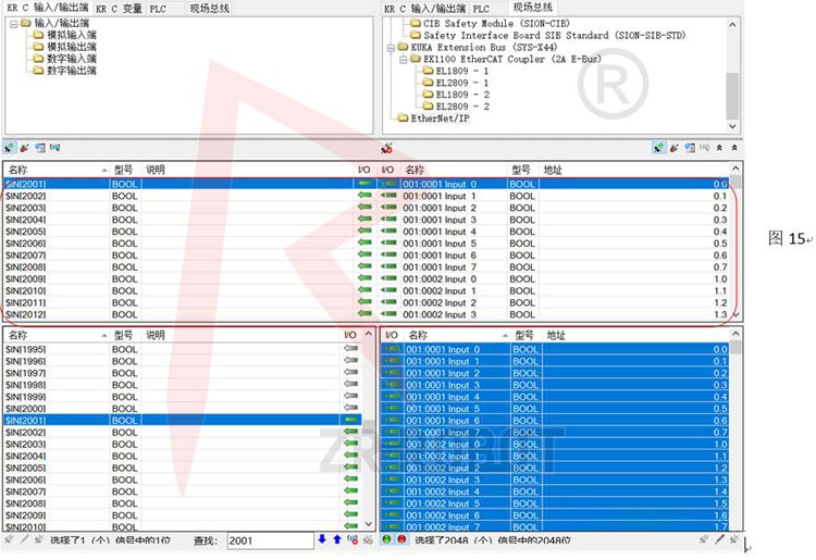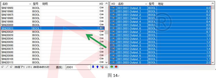 c.分割完后,進入圖14界面后,選擇機器人輸入的起始位置,在右邊框里CTRL+A選擇PLC的所有信號后,將其拖拉至左邊機器人的起始位置,如$IN[2001],鏈接完成后,可以看到如圖15的紅色區域,表示映射完成;