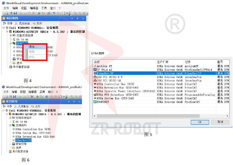 3.右鍵單擊總線結構,彈出界面如圖4紅色區域,然后點擊添加彈出圖5圖框,在該框內選擇Ethernet/IP并點擊該圖框的OK鍵完成添加,此時可以在總線結構下面看到Ethernet/IP總線,如圖6所示;